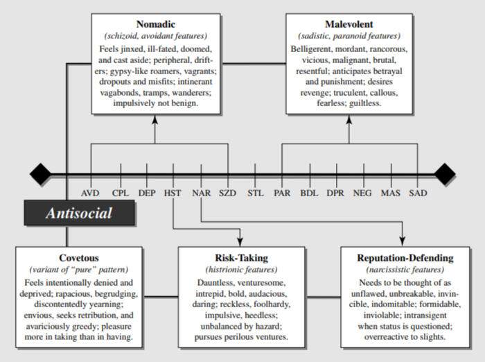 "Subclassifying antisocials, psychopaths, and criminals has been a hobby of social scientists for more than a century. Some schemes are based on the types of crimes committed or the severity of the crime, rather than on clusters of trait characteristics. Other schemes are based on methodology-driven approaches, such as cluster analysis. All such schemes fail to recognize the importance of considering other personality characteristics in addition to those of the major pattern. In contrast, the antisocial variants summarized in Figure 5.1 are described as combinations of constructs descended directly from the evolutionary theory (Millon, 1990). Note that other subtypes are possible, and not all antisocials fall neatly into one of the categories" [4].