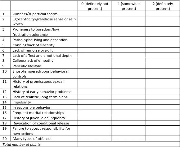 intended to be descriptive, not value-laden. The idea that psychopathology could occur in the absence of mental confusion then spread throughout Europe but was still hotly debated."Other physicians regarded antisocial individuals as being defective in character and, therefore, worthy of moral condemnation. The term moral insanity, first used by Prichard (1835), crystallized this notion. Prichard held that despite understanding the choices before them, their conduct was swayed by overwhelming compulsions. He also broadened the syndrome to include diverse emotional and mental conditions, all of which shared a common inability to guide themselves according to an inner sense of rightness, goodness, and responsibility. Though unscientific, the idea of moral insanity still has a certain appeal, if only because the normal person often has no way of identifying with the more pathological actions of antisocials and psychopaths. Dahmer and Mudgett, discussed briefly at the beginning of this chapter, provide two examples. Toni is certainly less extreme, though we still wonder why she cannot understand the consequences her actions will have on her life."Subsequent writers suggested parallels between anatomical defects and defects of character, though in a way that would be considered amusing today. For example, some believed that a specific cerebral center controlled morality (Maudsley, 1874). Just as some individuals are colorblind, some were regarded as morally blind. Other writers held that antisocials were born delinquents possessing common physical features, such as a large, projecting lower jaw, outstretched ears, sloping forehead, left-handedness, robust physique, precocious sexual development, insensitivity to pain, and muscular agility (Lombroso, 1887). Stone (1993) suggests that society needs the comfort of believing that criminals somehow look different to reassure ourselves that we are protected from true psychopaths, who cloak themselves with the trite and ordinary."Toward the end of the nineteenth century, psychiatry began to turn away from moral classification and toward observational research. Koch (1891) proposed that the term moral insanity be replaced by psychopathic inferiority, explicitly casting the syndrome as an “inferiority of brain constitution” (p. 54). Though his intentions were the same as those of Pinel—to classify scientifically rather than morally—the choice of words was poor. “Inferiority” was eventually dropped in later usage, after the term traveled to the United States. The term psychopathic, literally meaning “psychological pathology,” endured for the first three decades of the twentieth century, referring to a broad range of conditions far beyond our contemporary antisocial personality. Cleckley’s 1941 work [as pictured above] crystallized the construct of psychopathy in its modern form, thus launching a research tradition that has flourished ever since" [4].As of now, ASPD is considered the umbrella term for both sociopathy and psychopathy in the DSM-5-TR, although psychopathy can still be given as a separate diagnosis, just not an officially coded one. The primary diagnostic tool for psychopathy is the Hare Psychopathy Checklist-Revised (PCL-R). Below is the list of statements given to patients who are being assessed for psychopathy. With the highest score possible being 40, typically a score of 30 or more is indicative of psychopathy. A common criticism of the PCL-R is that it does not specify what falls under each category, particularly the statements involving marital relationships. Many psychologists have suggested that including "frequent marital relationships" makes it harder to assess younger patients, while others argue that "marital relationships" can be considered an umbrella for romantic relationships that did not lead to marriage.
