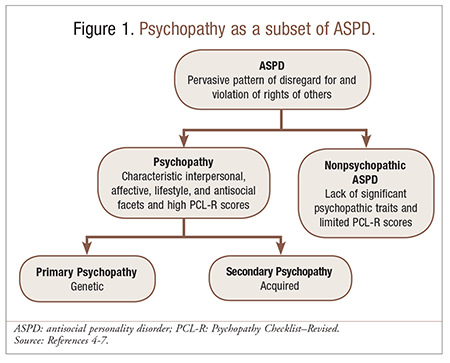 "The distinction between primary and secondary psychopathy was first proposed in the 1940s (1). The former, also referred to as idiopathic or constitutional psychopathy, was historically considered the 'true,' 'pure,' or essential type of psychopathy, also equated with a low anxiety psychopathic type (2), and later referred to as primary psychopathy. In contrast, secondary psychopathy, sometimes referred to as neurotic, symptomatic, or reactive, was thought to result from or be secondary to other psychiatric conditions, leading to terms such as 'neurotic sociopath' (3) and later termed 'secondary psychopathy.'"The antisocial behavior often found in secondary psychopathy is similar to that of primary psychopathy, but is considered secondary to what was previously termed neurotic conflicts (1, 4). Contemporary conceptualizations of psychopathy maintain a two-component framework, such as the two-factor model (5, 6), where Factor I includes traits or personality characteristics such as superficial charm, lack of remorse, callousness, and egocentricity, and Factor II includes antisocial behaviors such as criminal behavior and poor behavioral control." [6].