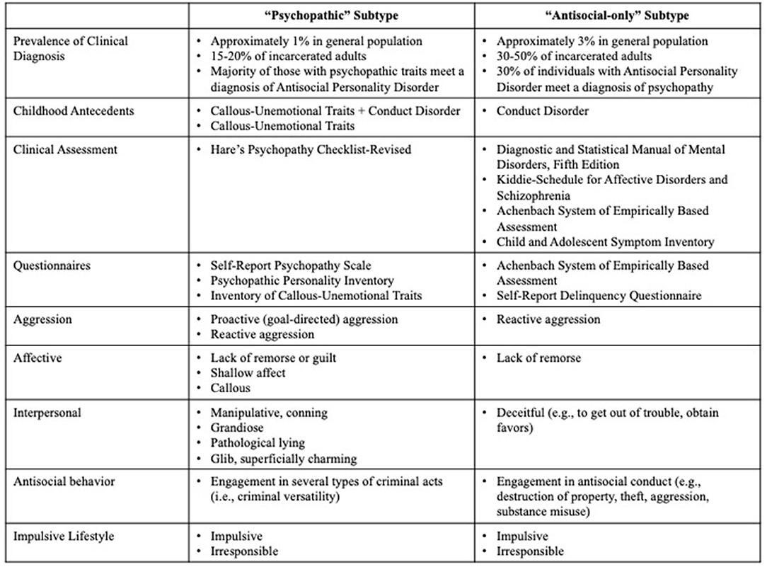 "The second subtype, the 'antisocial-only' subtype, is defined by their chronic impulsive, irresponsible, reactively aggressive, and antisocial behavior. Unlike, the 'psychopathic' subtype, these individuals are not characterized by grandiose charm and a callous, lack of empathy. Rather, individuals in this subtype are typically assessed using diagnostic criteria that reflect various antisocial acts only. Adults in this subtype can be identified diagnostically by assessing for antisocial personality disorder (ASPD) using the criteria put forth by the DSM-5. ASPD is related to repeated social norm violations, impulsivity, irresponsibility, and aggression that began in childhood to persist into adulthood (34). In order to receive a diagnosis of ASPD, individuals must meet criteria for CD prior to the age of 16 (which can be diagnosed retrospectively). In the DSM-5, youth with CD are characterized by a pattern of behaviors that violate the rights of others or societal norms in several ways (e.g., aggression to people or animals, destruction of property, theft, rule violations, etc.). In terms of prevalence, estimates suggest that between 50 and 66% of male prisoners meet criteria for ASPD (35, 36). Finally, some researchers, particularly using young samples, examine cumulative scores of conduct problems that cut across rule-breaking and aggressive behavior" [5].